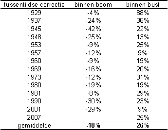 Onderstaande tabel laat zien welke correcties er binnen elke fase hebben plaatsgevonden. Om dit te verduidelijken: binnen het herstel van 1933-’37 daalde de beurs vanaf januari 1934 tot maart 1935 met 24%, om vervolgens weer sterk te herstellen. De linkerkolom geeft de neerwaartse correcties binnen een herstelfase weer, de rechterkolom de rallies binnen de recessies. Tussen twee recessies in doen aandelen het altijd wel goed. Duidelijk is alleen ook dat je je resultaat kan verbeteren door niet alleen tot de volgende recessie te wachten.