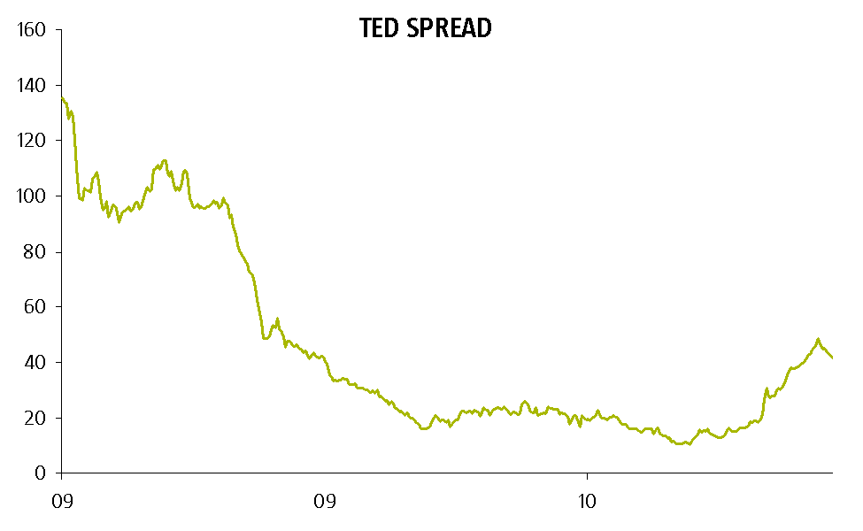 Dan heb je de eveneens vaker genoemde TED spread, het verschil in rente tussen interbancaire rente en kortlopende Amerikaans staatspapier. Hierbij gaat het eigenlijk om de stress in de interbancaire markt. Ook daar lijkt de trend eerder dalend dan stijgend