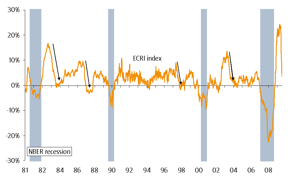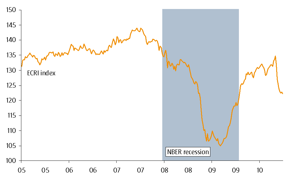 E??n van de maatstaven die hierbij vaak genoemd wordt is de zogenaamde ECRI leading indicator, waarbij ECRI voor de Economic Cycle Research Institute staat. Voor de volledigheid: dit is een zelfstandig Amerikaans bureau, opgericht door ene Geoffrey Moore, ????n van de toonaangevende onderzoekers op het gebied van conjunctuurindicatoren in de VS. Zijn naam is onder andere ook verbonden met het NBER (het instituut dat de recessies in de VS uitroept) en de Leading Indicator van de Conference Board (het instituut dat vorige week een foutje maakte met de Chinese Leading Indicator).