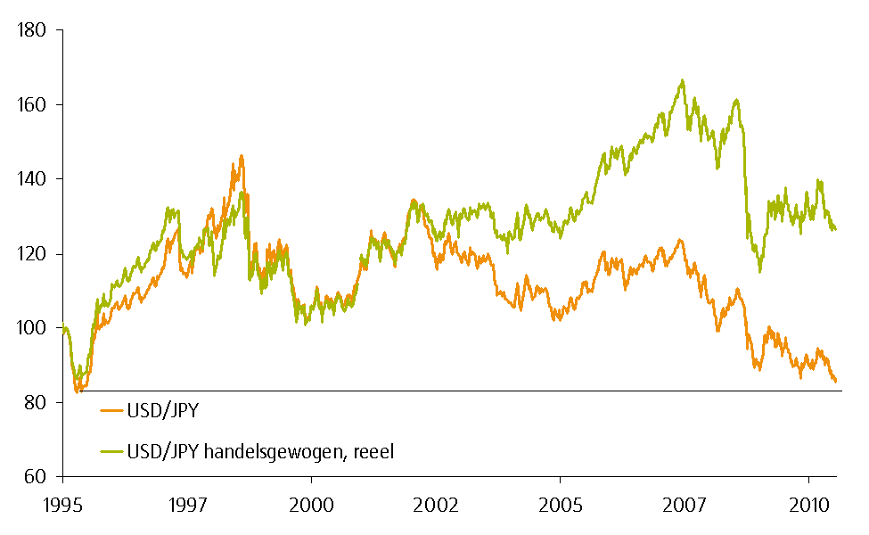 Op 24 augustus bereikte de dollar een niveau van 83.60 ten opzichte van de yen, waarmee de waardestijging van de yen in vier maanden tijd op meer dan 14% is uitgekomen. Ter vergelijking, de met veel bombarie aangekondigde nieuwe bewegingsvrijheid van de yuan heeft sinds midden juni een nietszeggende appreciatie van 0.5% opgeleverd. Aangezien Japan zowel Amerika als China als belangrijke handelspartner heeft en aangezien het economische herstel van Japan tot nu toe vrijwel volledig op de export georiënteerd is geweest, mag het duidelijk zijn dat een dergelijke opmars ook niet zonder gevolgen is geweest voor de beurs en de groeivooruitzichten. De Japanse autoriteiten zien de opmars van hun munt dan ook tandenknarsend aan.