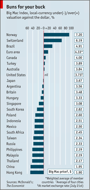 De redenering van de Financial Times begint (en eindigt) bij de zogenoemde Big Mac index. Deze index, die in 1986 door The Economist is bedacht, vergelijkt de prijs van een vergelijkbaar product (de Big Mac) tussen verschillende landen. Hiermee geeft de index invulling aan het idee dat je met 1 dollar overal ongeveer hetzelfde zou moeten kunnen kopen (purchasing power parity). Is de Big Mac in een land goedkoper, dan is dat een indicatie dat de munt is ondergewaardeerd, is de Big Mac index duurder, dan is de munt juist overgewaardeerd. Overigens betekent dat dan niet dat de munt ook echt zal aanpassen naar het evenwicht. Zo is de Zwitserse munt al sinds ze daar McDonalds hebben structureel overgewaardeerd. De Big Mac index is dan ook zeker geen voorspelmodel, al was het maar omdat lokale factoren als belasting, concurrentie (met andere hamburgertenten) en voorkeuren een rol spelen.