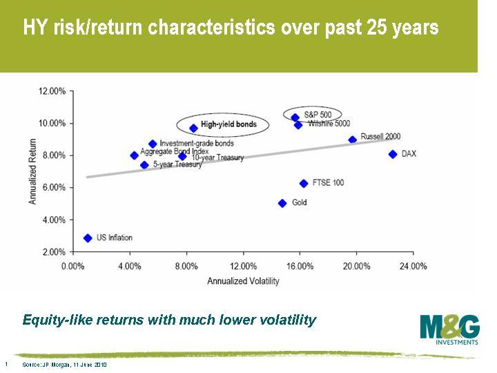 1. Hmmm de risk en return van de afgelopen 25 jaar, met het gemiddelde riskfree rendement van meer dan 6%… Zet je de risk free rente daarin op het huidige lage niveau, dan zijn high yield bond leuk, maar geeft de bond index blijkbaar nog meer rendement per eenheid risico. Maar dan blijft de vraag hoeveel een dergelijke grafiek 1960-1985 voorspelde voor 1985-2010. Vermoedelijk evenveel als deze grafiek zegt over 2010-2035, vermoed ik.