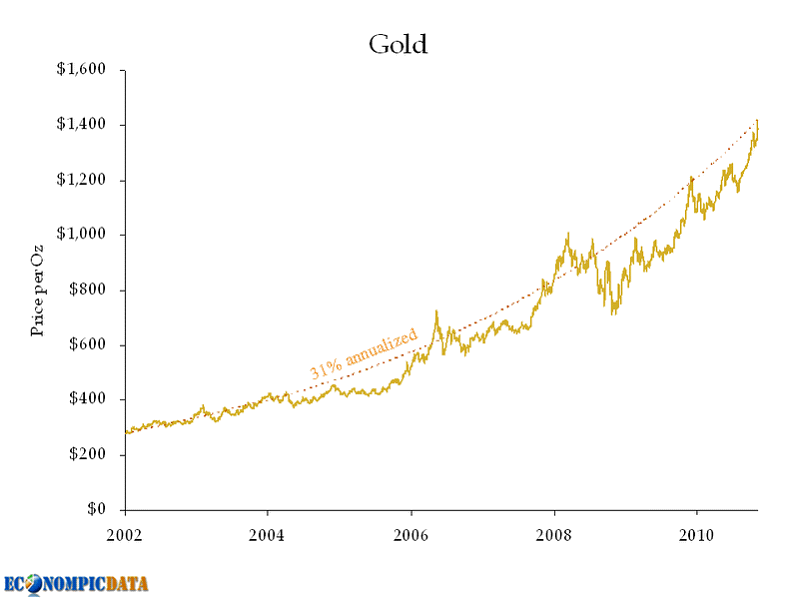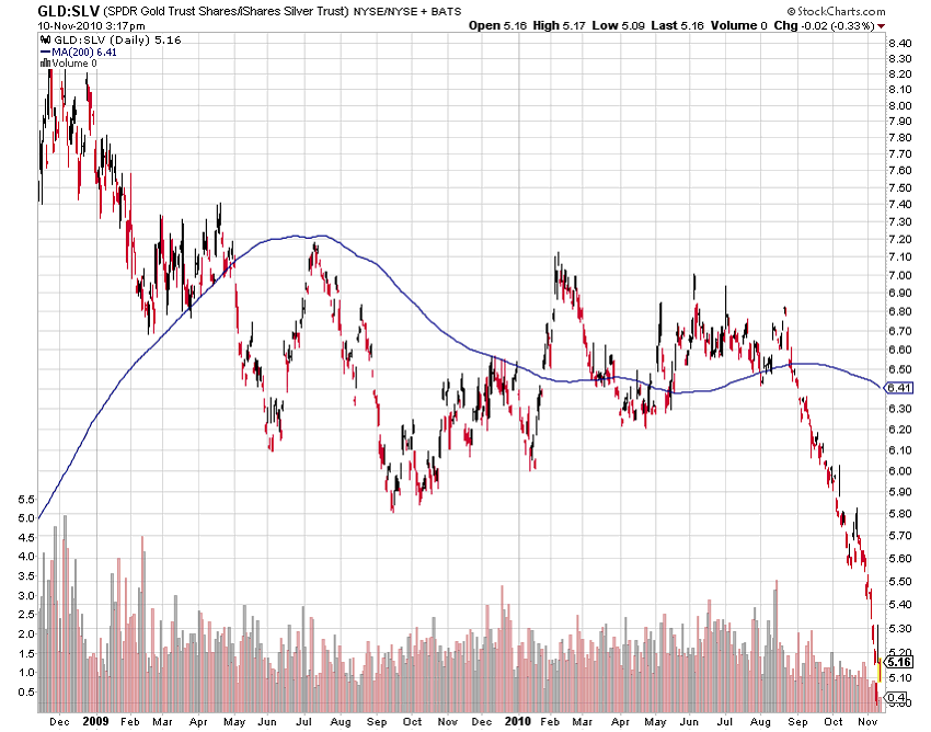 Goud in plaats van QE2Een thema dat deze week weer even erg actueel werd, was de goudmarkt. Goud zit al tijden in de lift, wat zeg ik, al jaren, zoals deze grafiek netjes laat zien: Wat dat betreft had goud helemaal geen hulp nodig, maar kreeg dat deze week uit onverwachte hoek toch, want Robert Zoellick, de president van de WereldBank schreef een artikel in de Financial Times dat hij voorstander was van goud als een soort van referentiekader voor een toekomstig wisselkoerssysteem. Zijn formulering was op zijn zachts gezegd wollig: ???The system should also consider employing gold as an international reference point of market expectations about inflation, deflation and future currency values. Although textbooks may view gold as the old money, markets are using gold as an alternative monetary asset today.??? De markt boog zich echter niet lang over de interpretatie en concludeerde dat Zoellick een voorstander zou zijn van een terugkeer naar de gouden standaard. Een stortvloed aan commentaren viel hem ten deel. Een paar ???niet altijd even vriendelijke- voorbeelden zijn deze van James Saft, deze van Brad De Long en deze van Mathijs Bouman. Jammer is dat ik geen link heb naar een column van mijn kamergenoot Leon Cornelissen, want die vroeg zich terecht af of het nou zo verstandig was om het monetaire beleid van de wereld over te dragen van mensen als Bernanke en Trichet, naar mensen als Medvedev en Mbeki, aangezien dat is wat je per saldo doet. Overigens, spreken is zilver en zwijgen is goud, maar het zijn de sprekers die het dit jaar bij het rechte eind hebben. Onderstaande grafiek zegt wat dat betreft genoeg: dit is goud, uitgedrukt in zilver sinds 2009. Downgrade VS, upgrade China