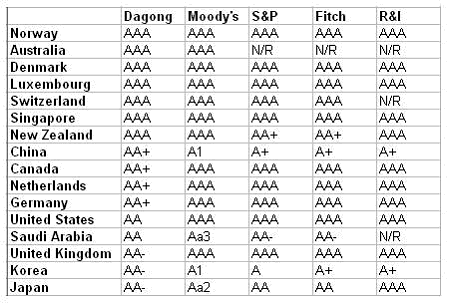 Maar we laten goud even voor wat het is: h??t nieuws van deze week was uiteraard verlaging van de kredietwaardigheid van de VS. Niet Moody???s, niet Fitch, zelfs niet Standard and Poor???s, nee, het was Dagong die durfde te gaan waar nog geen ander kredietbeoordelingsbureau was gegaan??? Dagong? Dagong. Net zoals we eens hebben moeten wennen aan een auto die Hyundai of Kia heette, is het nu de beurt aan het Chinese Dagong om zich als nieuwe naam zien te vestigen in de Westerse wereld. En, het moet gezegd worden, de headlines weten ze in elk geval goed te raken. Dat krijg je, als je de grootste economie ter wereld afwaardering van AA naar A+. Hiermee heeft de VS volgens het bureau eenzelfde kredietwaardigheid als Chili en Belize. Onderstaande tabel geeft aan hoe de ratings waren voor deze laatste aanpassing: Het hele rapport ???in niet al te zuiver Engels, maar verder zeker een collectors item- staat hier. De belangrijkste reden om tot de aanpassing over te gaan was (mijn vertaling en onderstreping) ???de verslechtering van de mogelijkheid tot afbetaling van schuld en de drastische afname van de intentie van de overheid de schuld te gaan betalen???. Nogal een boude uitspraak, als je het mij vraagt. Nou nemen ze sowieso geen blad voor de mond bij Dagong, zoals eerder dit jaar al duidelijk werd naar aanleiding van uitspraken van de chairman. Uiteraard de nodige commentaren, zoals hier, hier of hier. De algemene vraag lijkt eigenlijk te zijn wat dit nu voor een implicatie zal hebben voor het beleid van de Chinese autoriteiten en of die hun Amerikaanse staatsobligaties nu gaan verkopen. Maar daar heb ik het hier in een eerdere Best of the Week al eens over gehad. Overigens was het wel aardig te zien dat Moody???s slechts een dag later eveneens met een aanpassing van de kredietwaardigheid van een belangrijk land kwam. China, in dit geval, maar dan met een upgrade??? Dan nog het kopje overig vertier