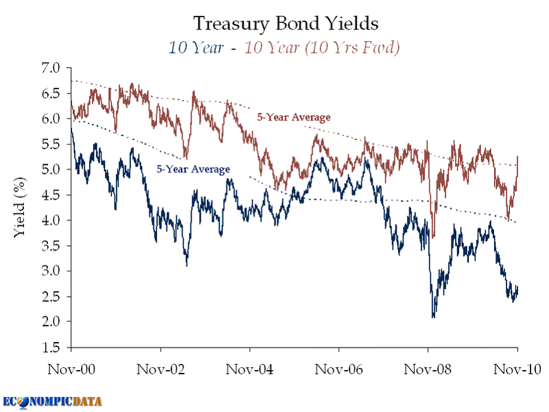 Een andere manier om het weer te geven is door de tien jaars af te zetten tegen de 10 jaars rente over 10 jaar. Die kan je afleiden van de 20 jaar rente en laat ???zoals te verwachten was- eenzelfde sterke stijging zien.Weer een andere manier om hier tegen aan te kijken is te stellen dat de 30 jaars rente nog steeds een echt marktevenwicht weergeeft, maar dat de 10 jaars rente dat ???door de aankondiging van QE2- niet meer is. Niet echt economisch, maar wel leuk om te zien: waar (en wanneer) klagen Amerikanen over?