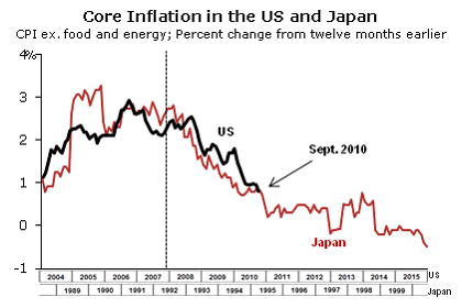 Het ziet er leuk uit en de boodschap is duidelijk: Amerika volgt Japan op de voet. De grafiek valt wat mij betreft echter in de rubriek twee-lijntjes-die-niet-bijster-veel-met-elkaar-te-maken hebben. Zo zijn de startpunten van de assen zo gekozen dat de lijntjes op elkaar vallen, niet om de periode van het barsten van de zeepbel te laten kloppen. De Japanse bubbel barste in 1989 (waar de grafiek ook mee start), die van de VS in 2007 (waar de grafiek dus niet mee start). Het ziet er leuk uit, laten we het daar maar gewoon op houden. Overigens zijn er wel meer mensen die zowel de charme als de tekortkoming van de grafiek inzien, zoals je hier kunt lezen.
