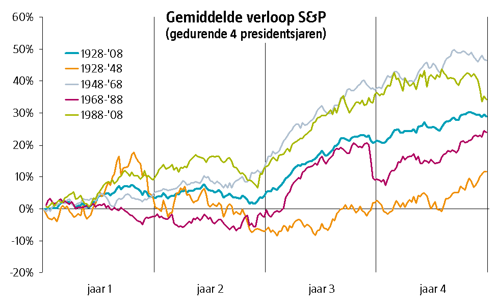 Om het een en ander te verduidelijken heb ik de cyclus zelf berekend. Onderstaand grafiek laat het gemiddelde verloop van de S&P 500 zien, gedurende de 20 presidentscycli die we sinds 1928 hebben doorlopen. Gemiddeld doen aandelen het twee jaar wat magertjes, tot aan de midterm elections (de tweede verticale lijn) om vervolgens los te gaan. Op basis van de weekdata die ik gebruikt heb, zien de jaarrendementen er gemiddeld als volgt uit. Het kan best zijn dat er elders andere percentages genoemd worden, maar dat hangt samen met het feit dat ik naar weekdata kijk en dus niet precies de dag van de presidentsverkiezingen als startpunt heb gebruikt. Lijkt een redelijk overtuigend verhaal, toch? Nou ben ik zelf niet zo heel erg happig op dit soort wetmatigheden, al helemaal niet als niet duidelijk is waar??m ze optreden. 80 jaar historie klinkt lang, maar als je bedenkt dat dat slechts 20 presidentscycli zijn, is er een aanzienlijke kans dat het door wat toevallige uitschieters veroorzaakt wordt. Toch lijkt ook dat wel mee te vallen. Onderstaande grafiek geeft naast het gemiddelde verloop over 20 cycli ook het verloop van telkens 5 achtereenvolgende cycli weer. Ook hier lijkt de boodschap duidelijk: weliswaar zijn er periodes geweest dat aandelen het minder deden, maar het derde presidentsjaar (gemeten van het begin tot het einde) springt er elke keer positief uit. Als ik de uitsplitsing verder doorvoer en per jaar naar de data kijk, blijkt het derde jaar in slechts 2 van de 20 keer een negatief rendement te hebben opgeleverd: in 1930 (-35%) en in 1938 (-1%). Alle andere ???derde jaren??? leverde een positief rendement op, waarbij de +36% van 1934 tot nu toe de sterkste positieve uitschieter vormt. Opmerkelijk is het zeker, maar voordat u uw huis nu gaat verpanden om aandelen te kopen, wil ik toch nog een laatste grafiek laten zien. Wederom het koersverloop van de afgelopen 20 presidentscycli, maar deze keer afgezet tegen het koersverloop van de laatste, nog niet afgeronde Presidentscyclus van Obama. De gemiddelde 30% die u normaal over 4 jaar krijgt, heeft u nu al over de eerste 2 jaar mogen ontvangen, de daling van 25% in de eerste maanden van de ambtstermijn van Obama ten spijt. Een strikte aanhanger in de presidentscyclus laat zich door zo???n grafiek niet van de wijs brengen. Dat ik op basis van zo???n grafiek gelijk ga kijken naar het achterliggende verhaal van de stijging, de waardering van aandelen en eventuele andere ontwikkelingen die een rol kunnen hebben gespeeld, geeft wat dat betreft duidelijk aan dat ik geen echte gelovige ben.