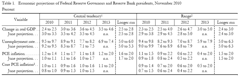 Nog een klein stukje over de Fed. Niet QE2, maar over een wat vreemde tegenstrijdigheid rond de FOMC vergadering. Afgelopen week werden de notulen gepubliceerd waarin volgens de traditie ook een schatting wordt afgegeven over de groei en inflatie voor de komende jaren. De tabel ziet er als volgt uit: Wat blijkt? De centrale projectie voor groei over 2011 staat op 3.0% tot 3.6% voor 2011 en 3.6% tot 4.5% voor 2012! Ter vergelijking, de consensusverwachting voor 2011 en 2012 ligt momenteel op 2.5% en 3.1% respectievelijk??? Anders gezegd, als we van de middenprik uitgaan verwacht de Fed dat de Amerikaanse economie gemiddeld 0.9% sterker zal groeien dan wat er nu verwacht wordt! Nou zou je kunnen denken dat dit optim