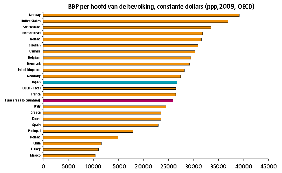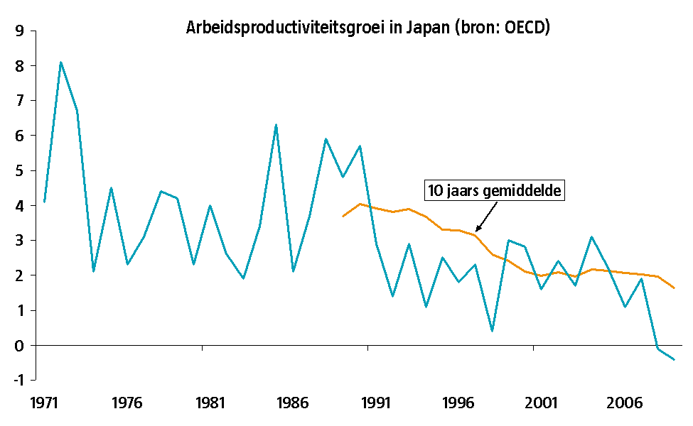 Maar goed, Japan. Komt dat ooit nog goed? Net zoals men 20 jaar geleden te lang vasthield aan het beeld van een groeiwonder, moet ik er uiteraard voor waken niet klakkeloos er van uit te gaan dat het slechts ellende zal blijven. Toch blijkt het moeilijk een positief stuk over Japan te schrijven en dat hangt voornamelijk samen met onderstaande grafiek, die de bevolkingsopbouw van Japan weergeeft. Ook hier blijkt Japan een ware voorloper te zijn, want het is het eerste grote ge??ndustrialiseerde land dat met de gevolgen van vergrijzing geconfronteerd wordt. Volgens de cijfers van de Verenigde Naties zal de groep werkende (20-65 jaar) de komende 5 jaar met 1,2% per jaar krimpen. De gevolgen voor de groei liegen er ook niet om. De omvang van het BBP kan namelijk maar op twee manieren groeien. Of doordat er meer arbeid wordt ingezet, of doordat dezelfde werknemers een hogere arbeidsproductiviteit aan de dag weten te leggen. Simpel gezegd, dat de beroepsbevolking de komende vijf jaar elk jaar gemiddeld met meer dan 1% in omvang afneemt, betekent dat Japan al een arbeidsproductiviteitsstijging van meer dan 1% nodig heeft om de omvang van de economie gelijk te houden. Groei hangt dus volledig af van arbeidsproductiviteitsgroei. Valt er iets zinnigs te zeggen over de arbeidsproductiviteitsgroei voor de komende jaren? Onderstaande grafiek laat het verloop van de arbeidsproductiviteit zien over de afgelopen jaren. Gemiddeld lag de groei in de jaren voor de crisis op zo???n 2% per jaar. Het valt alleen wel op dat het laatste jaar dat er daadwerkelijk 2% arbeidsproductiviteitsgroei was in 2005 was: de laatste vier jaar blijft Japan steevast onder de 2% steken. Nou kan je stellen dat die laatste twee jaar vertekend zijn door de gevolgen van de crisis en dat het vanaf 2010 allemaal wel weer goed zal komen. Het punt alleen is dat arbeidsproductiviteitsgroei over het algemeen bereikt wordt door investeringen, oude fabrieken die vervangen worden door nieuwere, arbeid door computers, dat soort werk. En juist wat de prikkels tot investeren betreft ontbreekt het in Japan momenteel. De keuze lijkt wat dat betreft niet moeilijk: investeren in een vergrijzende economie met groeiende overcapaciteit en lage groeivoeten, of dan toch liever in opkomende landen? Al te positief ben ik niet. De positieve draai is dat Japan wederom de twijfelachtige eer heeft om de rest van de wereld te laten zien hoe een belangrijke structurele wijziging (vergrijzing in dit geval) de economie zal raken. Hier in Europa zitten we weer op de eerste rij om de lessen te leren??? (origineel gepubliceerd op www.iex.nl)