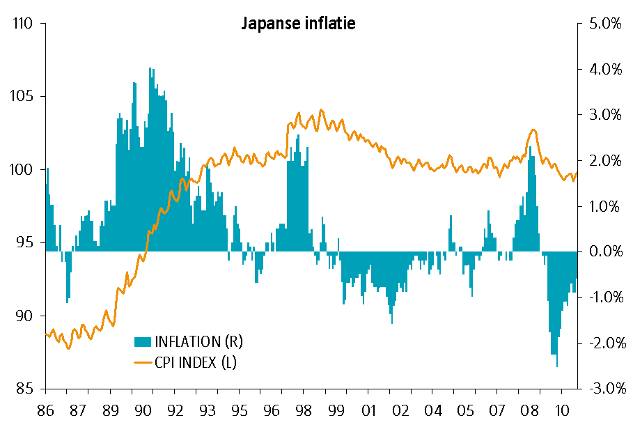 Sinds die tijd betekenen de woorden ???Japan-scenario??? iets heel anders dan dat het twintig jaar geleden betekende. Je leest nu discussies over de vraag of de Amerikaanse economie zal herstellen of in ???een Japan-scenario??? terechtkomt. Een Japan-scenario lijkt zo???n beetje het ergst denkbare scenario, erger nog dan de Grote Depressie die de Amerikaanse economie in de jaren dertig van vorige eeuw trof. Voor de duidelijkheid: dat is het niet. De gemiddelde Japanner is na twintig jaar ellende en depressie nog steeds even welvarend als de gemiddelde OECD-er en doet het wat dat betreft ook nog beter dan de gemiddelde bewoner van de eurozone. Ook qua werkloosheid komt Japan er ondanks twintig jaar recessies en deflatie heel wat beter vanaf dan de VS of Europa. Overigens valt het met die twintig jaar deflatie ook nogal mee. Onderstaande grafiek laat het verloop van de prijsindex en de jaar op jaar inflatie van Japan zien. Over de afgelopen twintig jaar bedroeg de jaarlijkse inflatie gemiddeld 0.2%, over de afgelopen tien jaar was dat gemiddeld -0.2%. Laag, dat zeker, maar van een zwart deflatiegat dat alles in zijn pad opslurpt is geen sprake. Optimisme houdt lang aanToch blijft het wonderbaarlijk te zien hoe optimistisch men indertijd was over Japan. Ik was rond die tijd werkzaam bij de Rabobank en daar stak bij elke vooruitblik op het nieuwe jaar het optimisme de kop weer op. Ja, uiteraard, dit jaar was het kwakkelen geweest, maar daarna: wacht maar eens af! En dat zeg ik niet omdat ik toen de wijsheid in pacht had dat het met Japan niet meer goed zou komen, maar meer om aan te geven dat het heel moeilijk is een beeld dat over de jaren is opgebouwd, weer los te laten. De 5% groei behoorde in een termijn van een jaar of drie altijd weer tot de mogelijkheden. Iets dergelijk zie je wat mij betreft ook gebeuren als je de groeiramingen van de Fed voor de komende jaren bekijkt (zie http://www.iex.nl/Column/59894/De-eurozonecrisis.aspx voor een tabel). Voor 2013 verwacht men de middenprik daar gewoon weer 4% groei. Overigens werd een dergelijke groei in het recente verleden alleen in de periode 1997-2000 bereikt. De twintig jaar v????r de kredietcrisis lag de groei gemiddeld op 2,8%. Japan???s krimpwonder