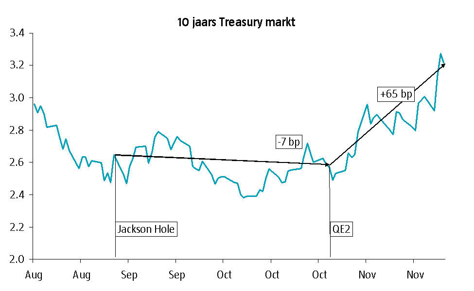 Buy the rumour, Sell the FedDrie weken geleden schreef ik op iex een column met de klinkende titel “Buy the rumour, Sell the Fed” waarbij ik aan de hand van een aantal grafieken liet zien hoe de financiële markten hadden gereageerd op de aankondiging van QE2. Het “Sell the Fed” hing daarbij samen dat juist de kapitaalmarkt duidelijk negatief reageerde, terwijl er in de andere markten (nog) geen duidelijke trend zichtbaar was. Ik vond die titel eigenlijk wel érrûg sterk. Sterker nog, ik wist gewoon zeker dat dit als een lopend vuurtje rond zou gaan en dat in no time heel bloggend Amerika mijn voorbeeld zou volgen. Zo overtuigd van mijn sterke vondst was ik, dat ik zelfs een screenshot heb gemaakt van de google search voor deze term, zodat ik later kon aantonen dat ik hier de trendsetter geweest was. Acht hits waren er, zes van mij en twee van een vage Duitse site uit 2006: die telden uiteraard niet. U voelt hem zeker al aankomen: ik zit nog steeds te wachten tot de term aanslaat. En toch is dat vreemd, want nu, drie weken later, is die conclusie eigenlijk alleen maar actueler geworden. Aandelen- en grondstoffenmarkten staan per saldo hoger en de enige markt die sinds 3 november lager staat is de obligatiemarkt. En dat terwijl QE2 juist direct voor de obligatiemarkt van toepassing is… Onderstaande grafiek geeft het beeld weer: Strikt genomen zou je verwachten dat de aankondiging van een USD 600 miljard aankoopprogramma tot rust in de obligatiemarkt zou hebben geleid, maar het omgekeerde is het geval. De aankondiging dat de Fed nauwelijks obligaties zou gaan kopen met een lange looptijd (30 jaar), gecombineerd met de angst dat QE2 ergens in de toekomst voor stevige inflatie zou gaan zorgen, leidde er toe dat eerst dat deel van de rentecurve onder druk kwam te staan. Toen de 30 jaars rente maar bleef oplopen, trok dat uiteindelijk de hele yield curve omhoog. Dat roept een interessante vraag op: wat moet de Fed doen de kapitaalmarktrente verder stijgt? Het lijkt een klassieke catch 22. Een verdere verhoging van de steunaankopen leidt alleen maar tot meer angst voor toekomstige inflatie, QE2 halveren zou echter betekenen dat je een signaal afgeeft dat je een verkeerde keuze hebt gemaakt. Dat laatste lijkt onwaarschijnlijk, waarbij ook de berichten over de publieke opinie over de Fed een rol zullen spelen. Er is een alternatief. The Economist geeft een suggestie in deze link, zij het dat die in dit geval over Europa gaat. De Fed kan een doelzone afkondigen waarbinnen de rente in een bepaald segment (bijvoorbeeld 10 jaars) zich mag bewegen. De wetenschap dat de Fed ongelimiteerd als koper in de markt staat als de grens wordt bereikt, zou er toe moeten leiden dat er per saldo geen obligatie van hand hoeft te wisselen. Deze optie is bij de laatste FOMC vergadering ook specifiek besproken, maar kwam men tot de conclusie dat: But participants also noted potentially large risks, including the risk that the Federal Reserve might find itself buying undesirably large amounts of the relevant security in order to keep its yield close to the target level. Overigens heeft de Fed in het verleden wel zulk beleid gevoerd en voorzover ik kan nagaan zonder dat het tot grote problemen heeft geleid. Van 1942 tot 1951 hanteerde de Fed een plafond van 2.5%. Voor nog wat meer achtergrond hierbij is de volgende link ook aan te bevelen. Andere stellen trouwens dat het nog wel mee valt met de sell-off, zoals we in deze link kunnen zien. Bovendien hing de laatste stijging van de kapitaalmarkt vooral samen met de nieuwe belastingdeal die Obama aan het begin van deze week afkondigde, als we deze link er op naslaan. Als laatste deze link ook nog, die vooral de moeite waard is voor de mooie quotes en omdat hij aanhaakt op de discussie die ik momenteel voer met Marcel tak. De quote die ik noem is deze en die gaat over obligaties: “They were “safe”. They made money. They were hot. Everyone was buying them. Until now. Bond investors are discovering that everyone can get it wrong.” Toonaangevende rapporten