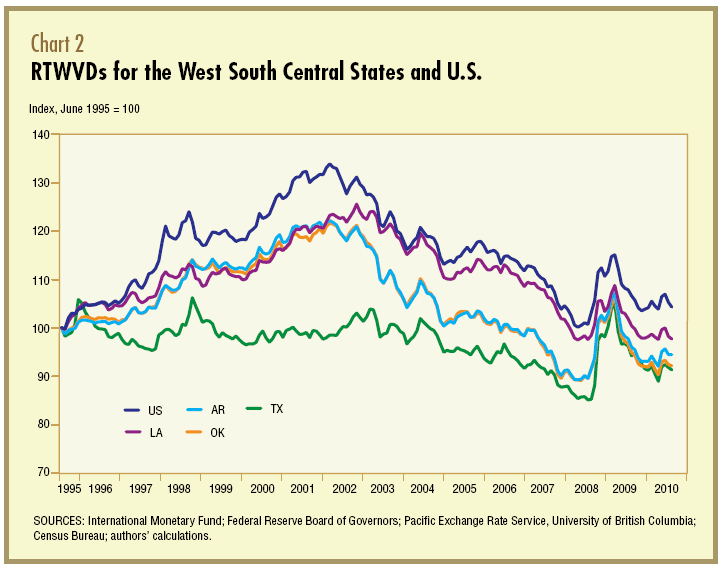 Aardig onderzoek van de Dallas fed: de ontwikkeling van de handelsgewogen dollar per staat.