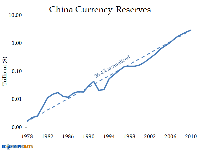 De Chinese valutareserves: rechte lijn omhoog. Maar wat als de yuan nou 10% in waarde stijgt?
