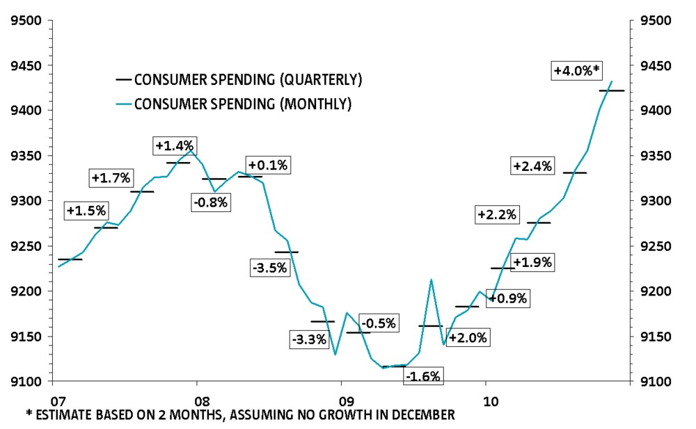Een getallenvoorbeeld kan dat makkelijk duidelijk maken. Stel je hebt een economie die in het basisjaar (zeg 2010) drie kwartalen niet gegroeid is met uitzondering van 1 kwartaal. In dat ene kwartaal groeit de economie met 1%, om vervolgens weer terug te keren op de nulgroeilijn. In het te voorspellen jaar (2011) blijft de economie vervolgens vier kwartalen stabiel. Met welk groeipercentage zal de economie het jaar 2011 afsluiten? Nul procent groei ≠ nul procent groeiOp het eerste gezicht zou je zeggen dat de te voorspellen groei 0% is. Vier kwartalen van 0% groei telt op tot 0% groei, toch? Niet dus. Weliswaar is de groei gedurende het jaar 2011 0%, maar de gemiddelde omvang van de economie in 2011 ligt wel degelijk hoger dan die van 2010, met dank aan dat ene kwartaal van groei in 2010. Aangezien de groei berekend wordt door de gemiddelde omvang van de economie in 2010 te vergelijken met de gemiddelde omvang van 2011 krijg je toch groei in 2011. In getallen (waarbij ik de 1% groei in het derde kwartaal heb laten vallen) ziet dat er zo uit: Groei, zonder groei: in 2011 komt de economie geen stap vooruit en toch mogen we aan het einde van het jaar een half procent groei rapporteren. Dit fenomeen staat te boek als het overloopeffect. Het interessante is nu ook nog eens de timing van dat ene kwartaal groei in 2010 ook nog eens een behoorlijke impact heeft op de ‘groei’ in 2011. Dat staat in onderstaande tabel samengevat. Je ziet: die ene procent groei kan een behoorlijke impact hebben op de groeiraming van 2011. Nogmaals, zonder dat de economie in 2011 daadwerkelijk groeit. Waarom ik hier nu over begin? Om de simpele reden dat er een gerede kans is dat de Amerikaanse economie wel eens met 1% kan gaan groeien in het vierde kwartaal. Of, om bij de Amerikanen wijze van presenteren aan te sluiten, een geannualiseerde groei van 4,1% zal laten zien (1% tot de vierde macht). De reden van deze optimistische inschatting zit hem in de ontwikkeling van de consumptieve bestedingen. Op basis van de maandelijkse cijfers die tot en met november bekend zijn gemaakt valt te concluderen dat de consument eind 2010 haar beste beentje heeft voorgezet, uiteraard ten koste van de besparingen. Zelfs als er in december geen groei wordt gerapporteerd, komt de teller al op 4% groei uit (zie onder). Aangezien de consument al 70% van het BBP voor haar rekening neemt, ligt een groei van 4% (op jaarbasis) daarmee binnen handbereik. De consensus gaat tot nu toe nog uit van 2.5% groei voor het vierde kwartaal, wat overeen komt met 0.6% op kwartaalbasis. Een groei van 1% zou wat dat betreft een meevaller zijn. Wat uit het voorgaande cijfervoorbeeld duidelijk mag worden, is dat je in dat geval ook niet verrast moet zijn dat de groeischattingen voor 2011 eveneens opwaarts zullen worden bijgesteld. Gratis en voor niets. (origineel gepubliceerd op www.iex.nl)