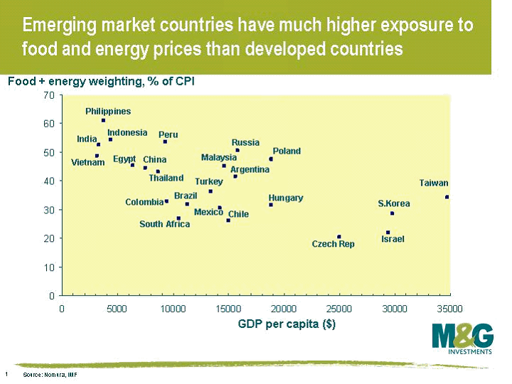 VoedselprijzenOm te beginnen een aardig overzicht van hoe groot het belang van voedselprijzen in de nationale inflatie precies is, afkomstig van een rapport van Morgan Stanley. Nederland ontbreekt in dit overzicht, maar voedsel en drank heeft een gewicht van 14,3%, waarmee Nederland zoals te verwachten viel aan de linkerkant van deze grafiek zou staan.