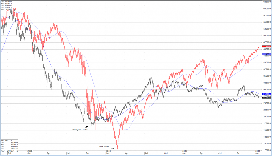 Nog eentje dan: de HangSeng en de Dow Jones. Als de HangSeng leading is, dan ziet het er niet goed uit…