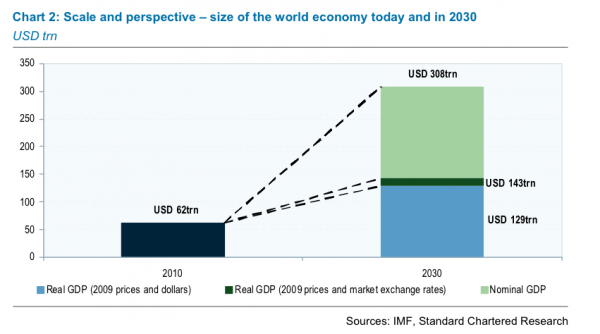 Standard & Chartered laat zien hoe groot de wereldeconomie er in 2030 uitziet. Een groeivoet van 3.9%: zouden ze weten dat de wereld vergrijst?