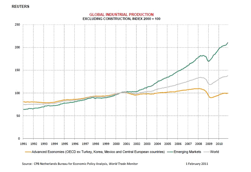 Nou heb ik vorige week al uitgelegd dat een belangrijk deel van het inflatieprobleem tot nu toe samenhangt met voedsel- en energieprijzen: de onderliggende inflatie in de VS en Euroland ligt er nog steeds vrij stabiel bij. Toch zie je ook hier wel al de eerste berichten langskomen dat we de bodem wel gehad hebben, zoals deze link uitlegt ten aanzien van de VS. Het ziet er naar uit dat huren weer aan het oplopen zijn, wat met een gewicht van 40% in de onderliggende inflatiemand niet zonder gevolgen zal blijven Ook deze grafiek vond ik erg aardig om een beeld te geven van het inflatieprobleem. De standaardredenering is dat het met inflatie wel los zal lopen omdat er nog voldoende productiecapaciteit (en werkloosheid) voorradig is. Een sterke stijging van de onderliggende vraag kan makkelijk worden opgevangen door het uitbreiden van productie, zo is de verwachting. Klopt, maar deze grafiek werpt een andere beeld op de overvloed van productiecapaciteit. Er is voldoende capaciteit in het Westen, niet in de opkomende landen… Als laatste nog deze link nog, die uitwerkt wat de impact van QE1 en QE2 op financiële markten en ook de onderliggende inflatie is. Fed: bedankt… Inflatiehedge?