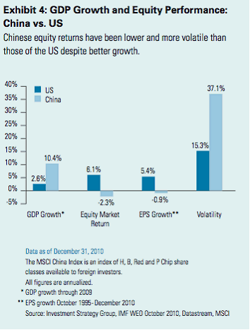 Een geheel andere invalshoek is het verband tussen groei en rendementen op aandelen markten. Onderstaande grafiek is afkomstig van een rapport van Goldman Sachs (waarvan ik geen link heb), waarvan een samenvatting te vinden is op alphaville. Als ik het goed begrijp gaat het rapport over de samenhang tussen groei en rendement op aandelen en dat verband blijkt niet altijd even sterk. De grafiek hieronder kijkt specifiek naar China. Wat blijkt: hogere economische groei heeft de laatste 18 jaar niet tot hogere rendementen op aandelenmarkten geleid??? Overigens geeft de grafiek ook de verklaring waarom Chinese aandelen het over deze periode niet zo goed hebben gedaan: winst per aandeel is in deze periode namelijk gewoon gedaald. Groei is kennelijk ????n ding, voor China, winst daarentegen??? Overigens heb ik me zelf niet in de achterliggende cijfers verdiept, dus laat ik de conclusies voor rekening van Goldman Sachs. Bovendien, resultaten uit het verleden???. En nu we het toch over China hebben: op deze link houden ze keurig bij waar, wanneer en in welke sector er in China gestaakt is. Of moet ik zeggen, gestaakt mocht worden, want ook dat wordt in China allemaal keurig geregeld naar het schijnt. Overige links