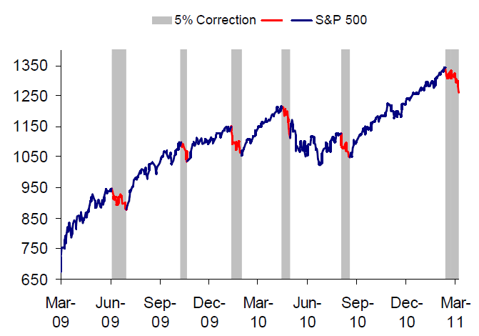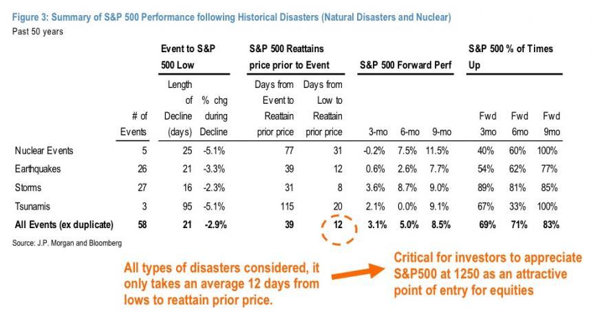 Dan deze van JPMorgan: hoe reageert de beurs doorgaans op natuurrampen? Een beetje how-to-lie-with-statistics kan je het wel noemen…
