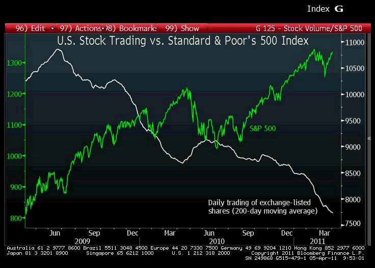 (bron: http://www.ritholtz.com/blog/2011/04/stocks-up-volume-down-2/)