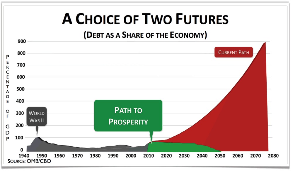 Enigszins gekoppeld aan de debt ceiling zijn de plannen die deze week door de Republikeinse volksvertegenwoordiger Paul Ryan zijn gelanceerd. In zijn 73 pagina???s tellende Path to Prosperity doet hij uit de doeken hoe Amerika volgens hem gered kan worden van de afgrond van alsmaar oplopende schulden. Onderstaande grafiek, afkomstig uit zijn plannen zegt wat dat betreft genoeg: Uiteraard brak vlak na de publicatie de nodige herrie uit. Zo bleek de groene lijn ten minste gedeeltelijk te dalen als gevolg van opmerkelijk optimistische aannames over de arbeidsmarkt, lonen en de kapitaalmarktrente. Zo daalt de werkloosheid in 2012 al op miraculeuze wijze met 2.1% ten opzichte van het basis scenario waar in de plannen van Obama mee wordt gerekend, maar bovendien daalt ede werkloosheid in 2020 tot een historisch dieptepunt van 2.8%. Desondanks kreeg Ryan volgens dit commentaar in elk geval de Benefit of the Doubt van het gerenommeerde Economist. Volgens het blad is er veel aan te merken op de plannen van Ryan, maar nu ligt er tenminste een plan. Wie trouwens meer wil weten over zowel het schuldplafond en de plannen van Ryan, dan is dit een heel aardig overzicht van de commentaren die in Amerika zijn verschenen. Overige links