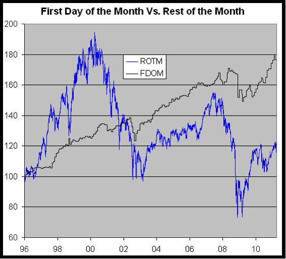 Een tweede effect dat het vroeger altijd goed deed was het weekend-effect, of het Friday-to-Monday effect. Koop op vrijdag in de close, verkoop op het slot op maandag. Ik weet zeker dat ik eens een mooie grafiek gezien heb om dat verloop weer te geven, maar stuitte al zoekende op een stukje dat juist het tegendeel bewees. Zoals je in deze grafiek ziet werkte het verband prima tot 2008, om daarna tot grote verliezen te leiden.