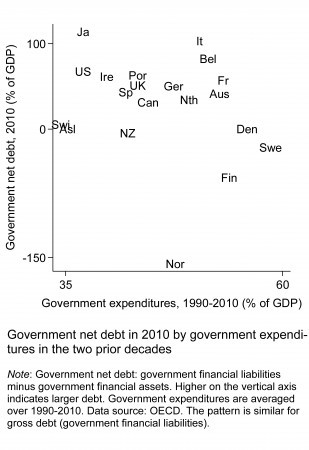 Aardig gegeven: meer overheidsbestedingen hoeven niet tot een hogere schuld te leiden. Alleen economische groei doet er niet toe, aangezien die op beide assen staat