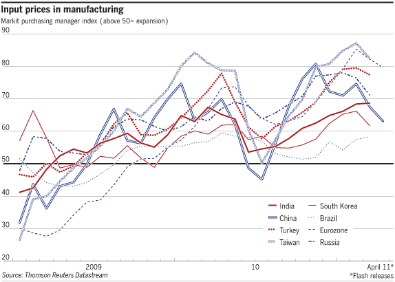 Inputprijzen van producenten in de opkomende landen liggen momenteel hoger dan in 2008