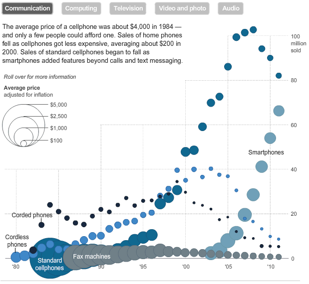 Deze is ook erg mooi. De rise and fall van communicatie apparatuur. Als je de orginele bron erbij pakt, dan kan je ook naar het verloop van computers en televisies kijken.