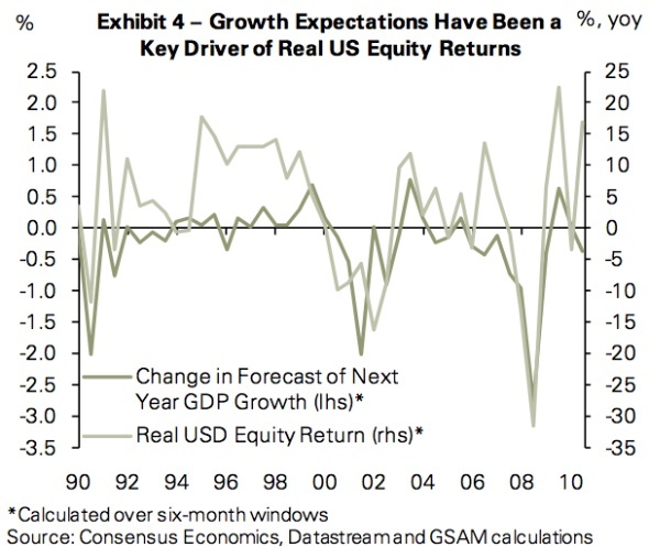 Verband tussen verwachte BBP-groei en opbrengst in de aandelenmarkt. Of je daar geld mee had kunnen verdienen, vraag ik me af