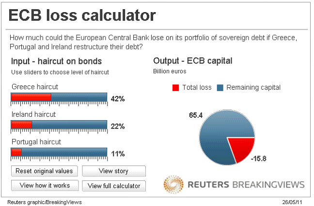 Goede vraag. Soms krijg je weken negatieve berichten te lezen zonder dat bijvoorbeeld de euro of de aandelenmarkt zich er iets van aantrekken. Om vervolgens op een gerucht of een downgrade (van Italië, no less) weer helemaal in elkaar te klappen. Ook ik heb inmiddels meer dan genoeg aandacht aan het onderwerp besteed, maar ontkom er niet aan om er in the Best of the Week met tijd en wijle aandacht aan te besteden. Voor lezers die het G-woord niet meer kunnen zien: gewoon even door scrollen naar het volgende kopje. Griekenland versus de ECBDe belangrijkste ontwikkeling van de afgelopen week is dat de aandacht verschoven lijkt te zijn naar de analyse van het probleem en de mogelijke oplossingen, naar de vraag wat een eventuele haircut nu precies voor een gevolgen zal hebben, met name voor de grootste tegenstander van deze uitkomst, de ECB. Deze tool van Reuters is wat dat betreft aardig. Vul zelf de niveaus van afstempeling in en dan krijg je een indicatie wat voor een gevolgen dat zou hebben op het kapitaal van de ECB. Hierbij gaat het echter expliciet om de door de ECB gekochte obligaties en dus niet om het onderpand. Over de kwaliteit van het onderpand kwam juist Der Spiegel deze week met een alarmerende bijdrage. Het artikel gaat over de kwaliteit van het onderpand dat bij de centrale banken (en daarmee indirect de ECB) is afgegeven en dan met name over het asset-backed gedeelte. Deze bijdrage is lezenswaardig in die zin dat er wordt voorgerekend wat de obligatiemarkt momenteel inprijst aan wat er moet worden afgeschreven aan Griekse schuld. In het 2 jaars segment –daar waar de rente het hoogst staat- handelt de markt momenteel op een ‘haircut’ van slechts 22%. Met een dergelijke afstempeling zou de Griekse schuld van 150% naar 117% verlaagd worden, waarmee Griekenland nog niet echt gered is. Is er ook nog iets positief te melden? Jawel hoor, hier bijvoorbeeld. Hier wordt voorgerekend (http://www.eudebtwriteoff.com/) wat je aan schuldreductie kan bewerkstelligen door wederzijdse schuld tegen elkaar weg te strepen. De grafieken zien er in elk geval mooi en bemoedigend uit, maar of de getallen kloppen vraag ik me sterk af: hoe Ierland van 130% naar 20% kan terugvallen is mij een raadsel.