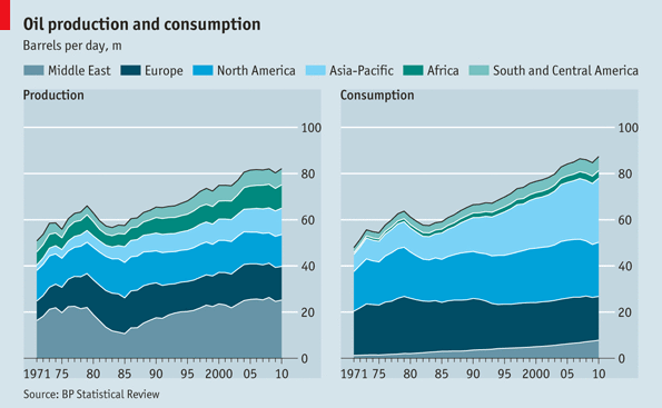 Hoewel de voorkant van The Economist ook wat stof doet opwaaien, deze week…. Op basis van het BP jaarboek van gisteren, de olieconsumptie per regioDe ECB graaft zich ook nog wat verder in…