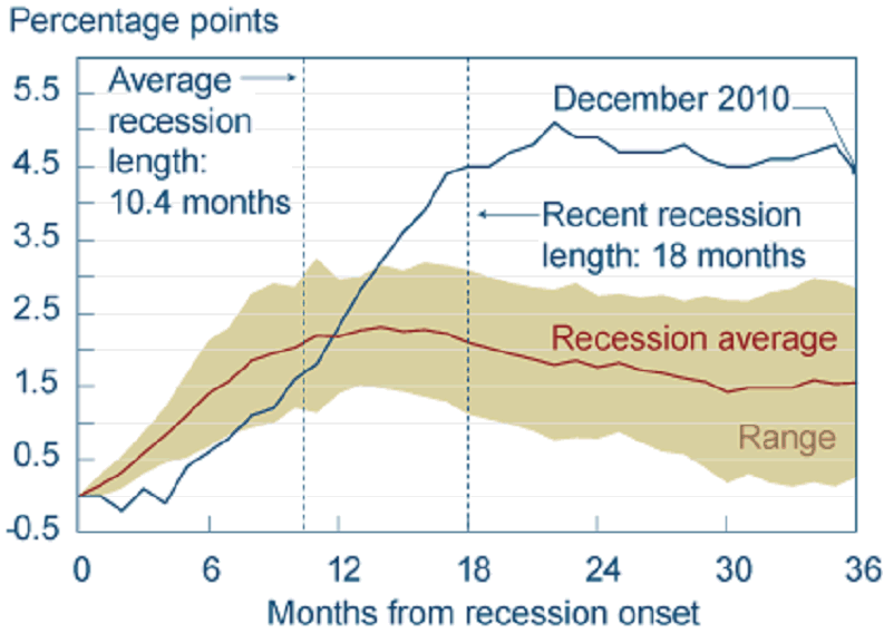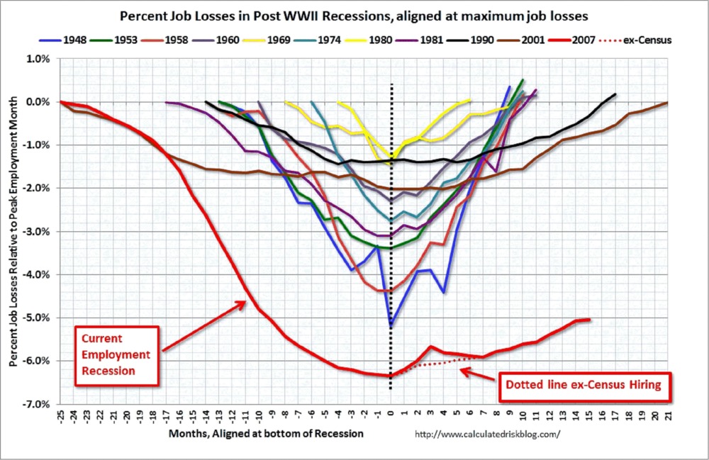 Jobless recoveryEr is veel mis met de Amerikaanse arbeidsmarkt, maar om toch met iets positiefs te beginnen, er is erg veel informatie over aanwezig. Geen land, dat zo veel historie en uitsplitsing geeft als Amerika. Aantal banen, werkzoekenden en gewerkte uren per bedrijfstak, regio, geslacht, leeftijd en zo kan ik nog wel even doorgaan. Er zijn dan ook volop sites die daar mooie tools van hebben gemaakt. Tot zover het goede nieuws. Het slechte nieuws is dat het met die arbeidsmarkt momenteel niet echt wil vlotten, en dat is wel wat vreemd. Als je de Amerikaanse arbeidsmarkt met die van Europa vergelijkt, staat de Amerikaanse over het algemeen te boek als flexibel: je kunt tegen relatief lage kosten mensen ontslaan en aannemen, waar dat in Europese landen niet altijd even makkelijk gaat. Bovendien is het sociale vangnet in Europa groter, wat er toe leidt dat werklozen minder geneigd zijn om -tegen een lager salaris- een baan te accepteren. Vroeger -of vroegâh zoals je dat eigenlijk hoort te zeggen- had dit tot gevolg dat de Amerikaanse arbeidsmarkt volatieler was, maar dat de werkloosheid per saldo lager lag, terwijl de werkloosheid in Europa relatief stabiel was, maar met als keerzijde een grote structurele component. In een recessie zoals we in 2009 hebben gezien, zou je dus voor de VS een sneller oplopende werkloosheid verwachten, die vervolgens gevolgd zou worden met een sterkere daling, relatief ten opzichte van Europa. De stijging, die hebben we gezien, maar die snelle daling… daar gaat het niet helemaal goed mee. Er zijn diverse grafieken die dat duidelijk kunnen maken, maar de meest beroemde is die van Calculated Risk, die bij ons beter bekend is onder de naam spaghetti-grafiek: De grafiek laat zien hoeveel banen er vanaf het begin van de recessie zijn verdwenen en hoe lang het duurde voordat die banen weer terugkwamen, voor alle recessies sinds de tweede wereld oorlog. Het aardige van deze grafiek is dat je duidelijk ziet hoe symmetrisch het normale verloop is: het duurt doorgaans ongeveer even lang om van het begin van de recessie naar het dal te komen, om van het dal dan weer naar volledig herstel te komen. En wat je duidelijk aan de rode lijn ziet, is dat die symmetrie in de huidige situatie ontbreekt… Een iets andere manier is de volgende weergave: de huidige recessie ten opzichte van het gemiddelde verloop van de voorgaande recessies.