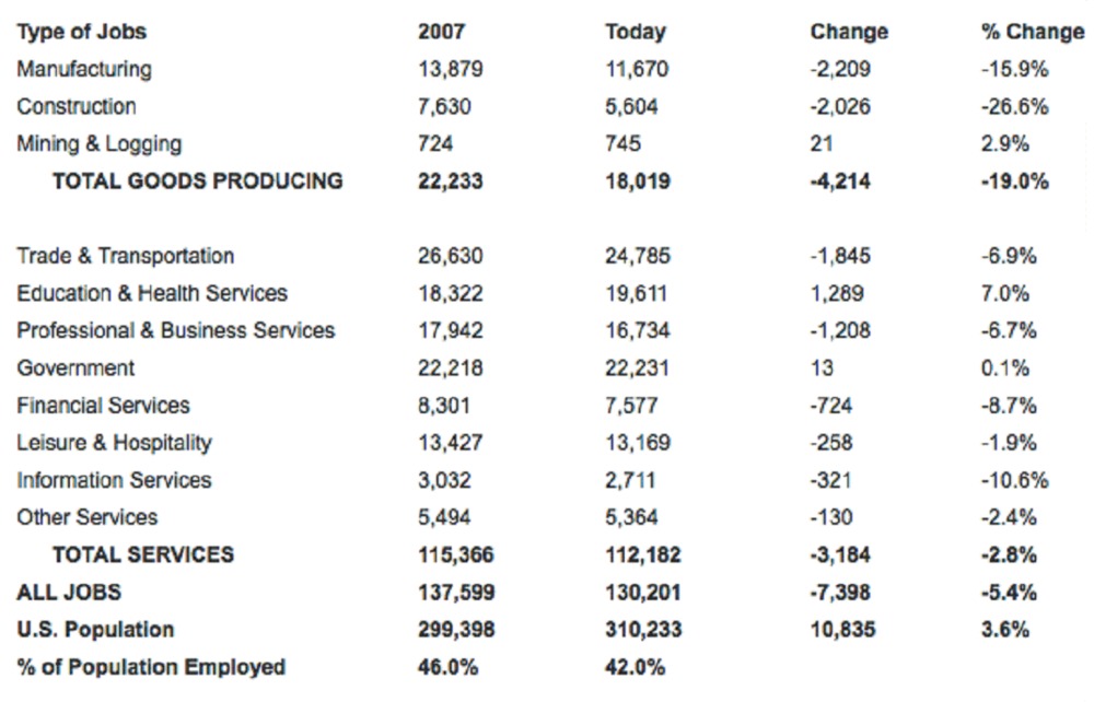 Dit fenomeen staat te boek als de jobless recovery. Strikt genomen klopt dat uiteraard niet: sinds het dieptepunt zijn er meer dan 2 miljoen banen bijgekomen, dus echt jobless kan je het niet noemen. Het is echter een schrale troost voor die bijna 7 miljoen mensen wier baan eveneens is gesneuveld en waar nog geen vervanging voor terug gekomen is. Nou zijn er diverse verklaringen voor het achterblijven van de banengroei. Ten eerste valt het economische herstel sowieso tegen, in vergelijking met andere recessies. Deze link geeft een aardige interactieve tool waarbij je de groei en de werkloosheid per Amerikaanse staat kan bekijken. Daarnaast heeft America Inc. het zwaar als gevolg van concurrentie met het veel goedkopere China (en de te goedkope yuan). Dit gaat vooral ten koste van de lager geschoolde banen in de industriële sector. Dat blijkt aardig uit de (inmiddels wat verouderde) tabel. Ook de teloorgang van de huizensector als werkgever is daarbij duidelijk. En dat het met die huizenmarkt niet goed gaat kunt u ook hier nog eens lezen