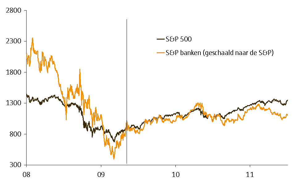 Stress testDe banken stress test: wat was dat ook al weer? Twee jaar geleden werd het mechanisme voor het eerst in de VS in werking gesteld. Het doel was om enerzijds banken te dwingen hun balans te versterken –als ze voor de stress test zakten- en anderzijds om bij financiële markten onzekerheid weg te nemen over specifieke financiële instellingen. Tot die tijd was het namelijk onvoldoende duidelijk welke financiële instelling de meeste risico’s liep met bijvoorbeeld de subprime crisis. Dát er financiële instellingen in de problemen wist iedereen wel, maar omdat niet zeker was welke, ontstond er een zichzelf vesterkende neerwaartse vertrouwenscrisis. In Amerika werkte het prima. Op 7 mei 2009 werd bekendgemaakt dat tien van de negentien geteste instellingen in totaal 75 miljard dollar uit de markt moesten halen om hun balans te versterken. Dat de helft van de banken de test niet haalde gaf de markt het vertrouwen dat het om een zware test ging, terwijl de totale kapitaalinjectie uiteindelijk geen onoverkomelijk probleem vormde. Bovendien was nu duidelijk wie de zwakke broeders waren (Bank of America, Wells Fargo), en wie sterke, waarmee de stress test een definitieve punt achter de vertrouwenscrisis zette. De publicatie staat hier, Onderstaande grafiek laat zien dat de stress test niet het keerpunt in de markt was, maar dat de onrust voor zowel de S&P500, als voor de (herschaalde) bankenindex daarna wel duidelijk is afgenomen. De rust keerde weer. Maar toen Europa…