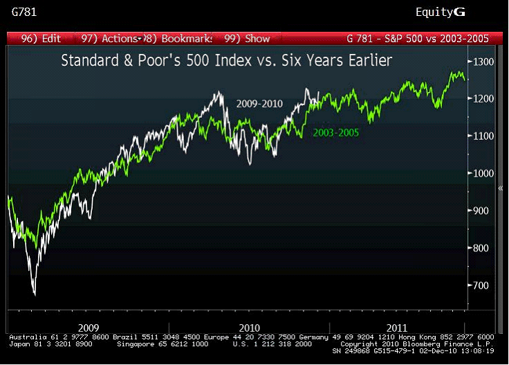 Een perfecte samenhang: als dat geen uniek verkoopsignaal is, dan weet ik het ook niet meer. Dat de blauwe lijn in de vijf maanden die volgden met een nette 15% omhoog ging zal je dus ook niet zo snel te zien krijgen. Twee lijntjes die eigenlijk helemaal niets met elkaar te maken hebben… Onder hetzelfde kopje de S&P met zichzelf 6 jaar eerder. De witte lijn is inmiddels aan de bovenkant van deze grafiek verdwenen.