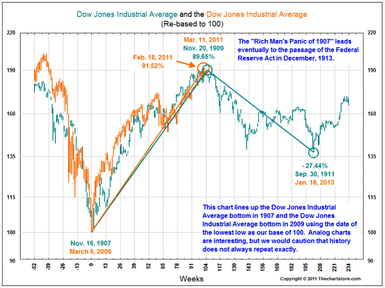 En de Dow Jones uit 1907 met die van nu… Ook hier zien we dat de oranje lijn in de werkelijkheid inmiddels losgekoppeld van de groene.