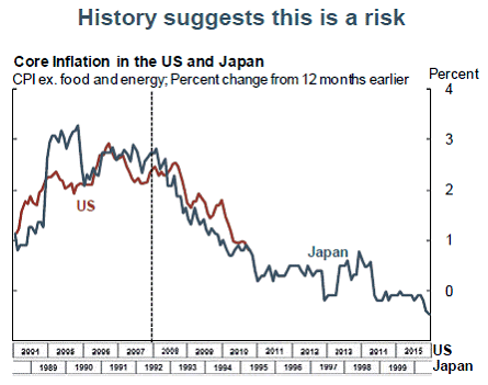 In dit geval gaat het om de inflatie ten tijde van de Japanse zeepbel en de Amerikaanse zeepbel, dus helemaal uit de lucht vallen komt het verband nou ook weer niet. Echter, de dwang om de twee lijntjes op elkaar te laten vallen overheerst. De lijnen zijn namelijk niet getimed op basis van het knappen van de zeepbel (eind 1989 in Japan, 2007-’08 in de VS), maar gewoon om de daling die plaatsvond te laten kloppen (1992 voor Japan). Dat Japanse autoriteiten totaal anders reageerden op de crisis dan de Amerikaanse kon al een aardige indicatie zijn dat er een verschillend verloop zou plaatsvinden. Als we het blauwe lijntje zouden doortrekken, zou de kerninflatie in de VS nu rond de 0.3% moeten bedragen. In werkelijkheid bedraagt die inmiddels weer 1.6%… Twee variabelen doen het ook goed…