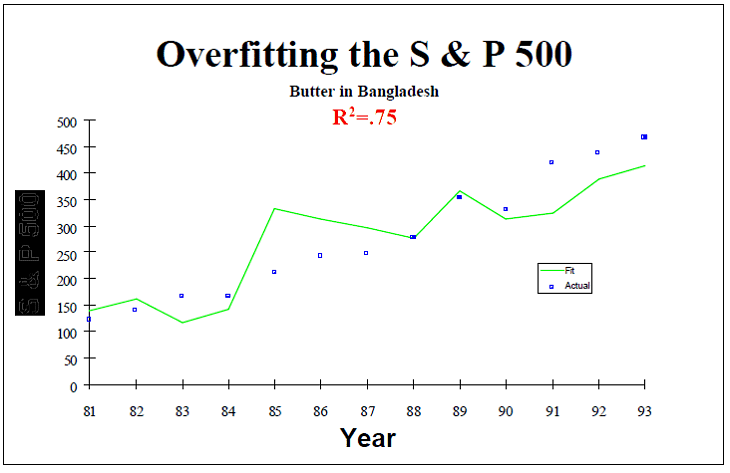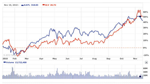 In het onderstaande geval hadden ze de tijdsas juist wat korter moeten maken om nog enigszins geloofwaardig te kunnen overkomen. Theoretisch kan ik nog wel een verband bedenken tussen goud en het schuldplafond (hogere schulden = failliet Amerika = goud kopen), maar dat betekent niet dat de prijs van goud altijd doet wat het schuldplafond doet, zoals de grafiek ook duidelijk laat zien. Eigenlijk zijn dit gewoon twee lijntjes die alle twee omhoog tenderen. Het klassieke voorbeeld hiervan is dat je inflatie-index van –zeg- België neemt (die vrijwel altijd oploopt) en afzet tegen de omvang van de wereldbevolking. Je zult zien, dat levert een heel mooi verband op, maar om nou te zeggen dat de inflatie-index een goede voorspeller is van de wereldbevolking… Robeco collega Laurens Swinkels (@LaurensSwinkels) gaf via twitter een mooi verbeeld van zo’n ‘verband’. Het gaat hier om het (overigens ludiek bedoelde) verband tussen de boterproductie in Bangladesh en de S&P500. Het stuk zelf is zeer lezenswaardig, zeker de ‘polynominal fit’ die 100% scoort als verklarende variabele! Overigens wordt er gelukkig ook nog wel eens teruggekeken naar oude verbanden, die het ‘vroeger zo goed leken te doen’. Daarbij wordt overigens niet altijd de juiste conclusie getrokken. In dit specifieke geval zou de conclusie moeten zijn dat het consumentenvertrouwen geen goede samenhang vertoont met de beurs, de maker van de grafiek kiest er echter voor om het als een tijdelijke (?) misprijzing te zien. Nou vind ik helemaal niet erg om naar een niet-bestaand verband te kijken, maar dan moet het op zijn minst goed uitgevoerd zijn. Onderstaande grafiek laat de handelsbalans zien (groene lijn) en de dollar (rode lijn). Ook hier is het theoretische verband zeker aanwezig, maar lijkt er eigenlijk sprake van twee totaal willekeurig gekozen lijnen, met verschillende start en eindpunten. En deze is ook te goed om te laten liggen: Apple versus zilver! Al met al kun je dus aardig wat mooie verbanden laten zien, als je maar niet al te kritisch bent over de achterliggende boodschap. Ik draai het liever om: altijd erg kritisch zijn als je een mooi verband krijgt voorgeschoteld.