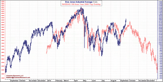 History repeats itself…Twee lijntjes grafieken komen er in vele vormen en maten. Een hele populaire is dat je de beursontwikkeling van dit moment over de beursontwikkeling van een ander moment heen legt. Of over die van een heel andere beurs, zoals je vaak ziet dat de Japanse Nikkei figureert in rampzalige voorspellingen. Zeker, het levert mooie resultaten op, zoals deze, die negen maanden geleden de ronde deed: