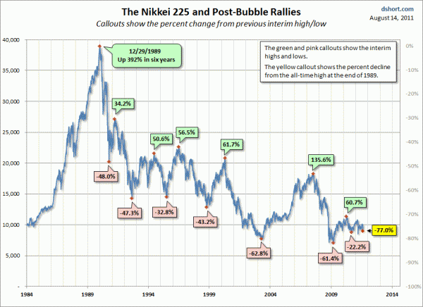 Deze heb ik al een keer eerder laten zien, maar hij blijft mooi: hoeveel de Nikkei wel niet gerallied heeft de afgelopen 20 jaar