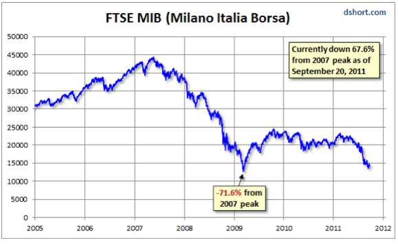 Deze is toch ook opmerkelijk om te zien: Italiaanse beurs al weer gevaarlijk dicht bij de bodem van begin 2009
