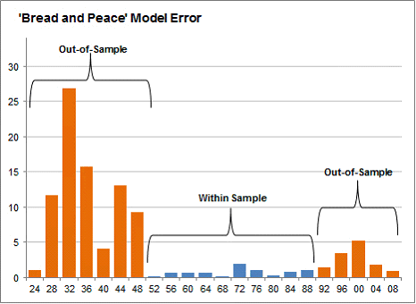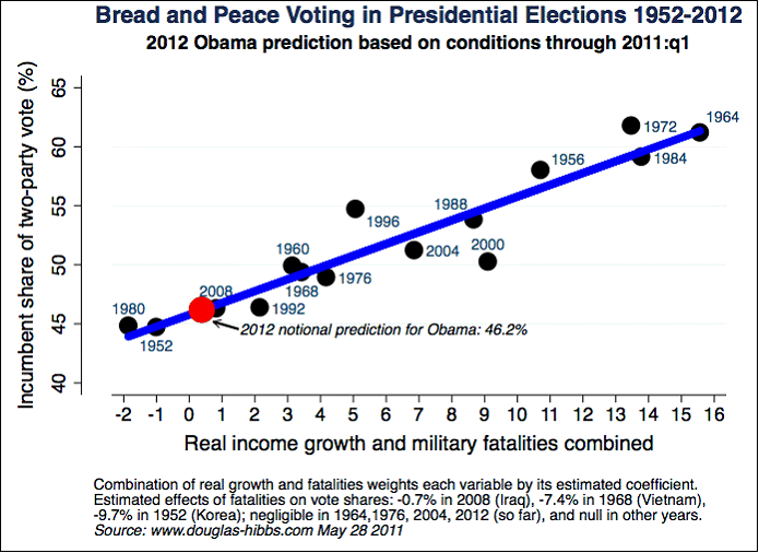 Het ziet er solide uit, maar de foutenmarge is (te) groot. In 1952 bijvoorbeeld zat het model er maar liefst 8% naast, een foutenmarge die dan ook de verkeerde voorspelling opleverde. Puur alleen op basis van de economie kom je er niet. Dat was ook de conclusie die Douglas Hibbs trok. Met de toevoeging van slechts ????n hele simpele variabele wist hij het model een heel stuk te verbeteren: Amerikaanse oorlogsslachtoffers. Zijn model, bekend als het Bread and Peace model ziet er als volg uit: Het mooie van deze grafiek is dat hij ook gelijk laat zien wat de voorspelling is als er nu verkiezingen zouden worden gehouden. Uitkomst: Obama is toast. Is er dan geen hoop meer? Tuurlijk wel, want ook het model van Hibbs is niet onbekritiseerd gebleven. De onvolprezen New York Times nam de moeite om wat extra datapunten aan de grafiek van Hibbs toe te voegen en kwam op deze uitkomst uit. Of de onderliggende getallen allemaal kloppen weet ik uiteraard niet, maar interessant is het zeker. Meer in het algemeen kun je je afvragen of de kiezer Obama de schuld zal geven van de economische zwakte en de body count. Obama begon zijn ambtstermijn op het moment dat de economie in de afgrond viel terwijl de oorlog eveneens een erfenis van zijn voorganger. Dat hij er in de drie daarna volgende jaren niet in geslaagd is het economische tij duidelijk te keren is uiteraard niet positief, maar hij kan daarbij ook de schuld bij de Republikeinen leggen, die vanaf 2010 de politieke besluitvorming hebben lamgelegd. Wat dat aangaat is het interessant om te zien hoeveel van zijn ambitieuze Jobs Act zal worden goedgekeurd: ik verwacht er niet veel van. Daarnaast is het uiteraard de grote vraag wie de kandidaat van de Republikeinen zal zijn. Als dat een extreme kandidaat van het ???tea party???-type (zeg Bachmann) is -niet waarschijnlijk, maar toch- dan is Obama alles behalve toast. Maar maakt het eigenlijk wel zoveel uit wie de verkiezingen gaat winnen? Aanhangers van de Presidential Cycle stellen van niet: beurzen doen het altijd goed in het vierde jaar van een ambtstermijn. Zelf vind ik dat de verkiezingen qua timing onwaarschijnlijk ongelukkig uitkomen, aangezien het betekent dat er de komende 14 maanden totaal geen beleid gevoerd kan worden. Of er na november 2012 w??l weer structureel beleid gevoerd zal gaan worden hangt overigens sterk af van de uitkomst van de Senaatsverkiezingen (33 van de 100 zetels) en de verkiezingen voor het huis van afgevaardigden (alle 435 zetels). ??(origineel