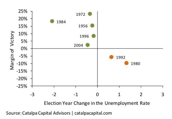 Waarmee ik eigenlijk alleen maar wil aangeven dat deze Best of the Week wederom niet over de eurocrisis gaat. Nee, ik gooi het over een andere boeg, ik behandel een thema dat n????it verveelt. De Amerikaanse presidentsverkiezingen! Wie gaat de verkiezingen van november volgend jaar winnen? It???s the economy, stupid!Het antwoord op die vraag is simpel, als je onderstaande grafiek mag geloven. Kijk naar hoe de werkloosheid zich in het verkiezingsjaar zich ontwikkelt! Onderstaande grafiek geeft het verband duidelijk weer: stijgt de werkloosheid dan wint de tegenstander de verkiezingen, daalt de werkloosheid, dan wint de zittende president.