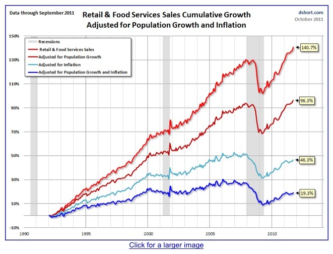 Uiteraard gaat het om het rode lijntje, maar als je voor inflatie en bevolkingsgroei corrigeert (blauwe lijn) zitten we nog 10% onder de top…