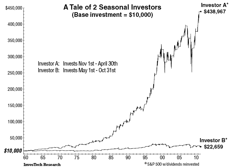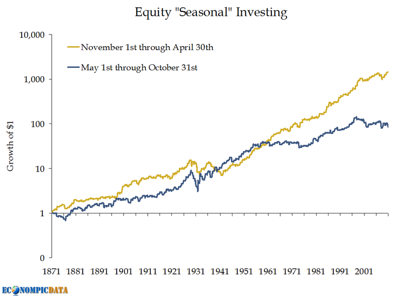 Of deze grafiek klopt heb ik niet gecontroleerd, maar dit is de impact van het Sell in May effect…