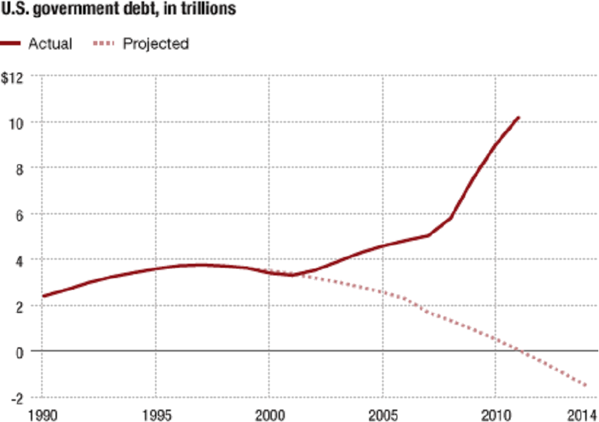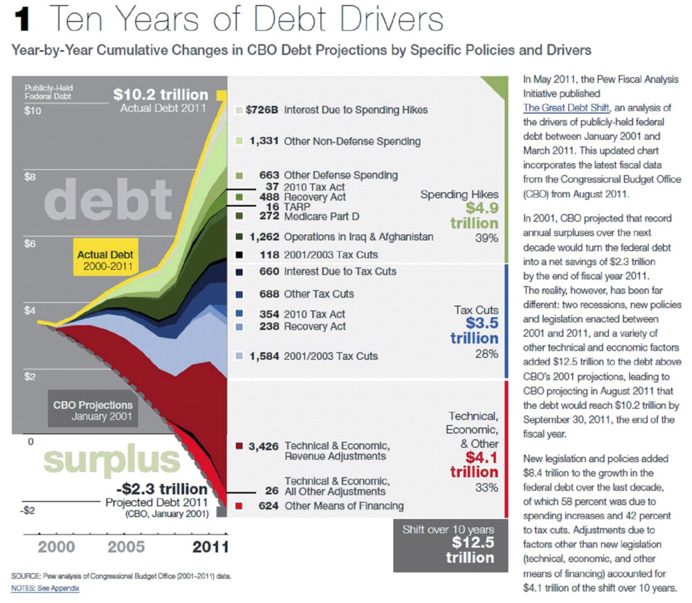 Een geheel andere invalshoek is de vraag wat er zou gebeuren als er geen staatsschuld meer zou zijn. In 2000 ging men er nog vanuit dat de Amerikaanse staatsschuld zelfs helemaal afgelost zou zijn. Onderstaande grafiek laat keurig zien waar het ???gat??? dat inmiddels is ontstaan precies is opgebouwd. Een paar oorlogen en wat tegenvallende groei hakken er behoorlijk in… Je kan het je op dit moment niet meer voorstellen, maar in 2000 maakte men zich zelfs zorgen over wat er zou gaan gebeuren als alle schuld afbetaald zou zijn. Hoe zou de wereld er uit zien zonder Treasuries? Tijdens Clinton werd daar serieus over nagedacht en werd er zelfs een rapport over geschreven dat uiteindelijk niet gepubliceerd mocht worden. Dankzij de programamakers van Planet Money is het rapport ???inclusief aantekeningen in de kantlijn- onlangs toch boven tafel gekomen. Ook de podcast over het onderwerp is de moeite waard. Maar we kunnen het uiteraard ook helemaal omdraaien. Schuld? Wie heeft het over schuld? Het is vermogen! Iemand heeft al die schuld gekocht en heeft dus een gigantische pot met geld (of schuld, eigenlijk). Pensioenfondsen, verzekeraars, Chinezen, de oliedollars: al dat geld moest uiteraard ook ergens neerslaan. Als je zo redeneert kan je stellen dat de aloude wet van Say van toepassing is: elk aanbod creeert zijn eigen vraag. Volgens deze redernatie is het dus niet de ???schuld??? van de overheden en de consumenten dat ze zich steeds verder in de schulden hebben gestoken, maar ligt de oorzaak juist bij de vermogenden van deze aarde. Ook u en ik, via de grote pensioenpot die we met zijn allen hebben opgebouwd. En daarmee zitten we weer helemaal in de huidige tijdsgeest: het zijn ???de rijken??? die het gedaan hebben…