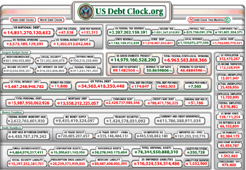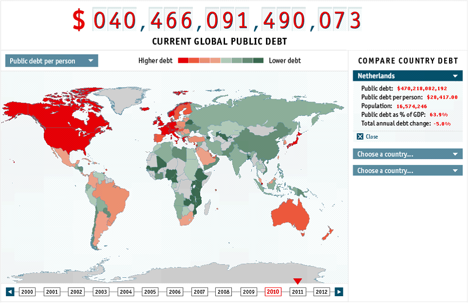 Overigens is The economist absoluut niet uniek met zijn schuldklok. De eerste echte schuldklok werd in 1989 door Seymore Durst in NewYork gelanceerd. Uiteraard ging het hier slechts om de Amerikaanse, die toen nog onder de 3 biljoen stond. De originele klok is inmiddels vervangen en verplaatst, en is op Sixth Avenue te bewonderen. Ook op het internet is het een komen en gaan van schuldklokken, zoals deze voor de VS. Het aardige van deze 'klok' is dat het niet alleen de overheidsschuld weergeeft, maar ook die van de particuliere sector. De totale schuld bedraagt dus niet 14,9 biljoen dollar, maar 54,6 biljoen. Dat komt overeen met 175 duizend dollar per Amerikaan… Ook Nederland heeft zijn eigen schuldklok, waarbij het overigens alleen om de staatsschuld gaat. Momenteel bedraagt de schuld voor elke Nederlander 23 duizend euro. Als vader van vier kinderen heb ik dus nog een stevige rekening openstaan… Waar komt die schuld toch vandaan?
