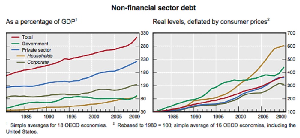Waar komt de onwaarschijnlijke groei van deze schuldberg toch vandaan? Om met een kleine geruststelling te beginnen, de getallen klinken vaak dreigender van dan ze zijn: absolute bedragen zijn niet altijd even zinvol om naar te kijken. Ook de omvang van de economie is sinds 1989 uiteraard aanzienlijk in omvang toegenomen. In nominale termen -dus re??le groei + inflatie- steeg de omvang van de Amerikaanse economie van 5,5 biljoen naar 15 biljoen. Weliswaar minder dan de schuld, maar het geeft in elk geval wel aan dat de absolute bedragen snel kunnen vertekenen. De klassieke manier om het schuldprobleem ???op te lossen??? is dan ook vaak om de (nominale) groei van een economie te stimuleren. Op die manier wordt de schuld in relatieve termen steeds minder belangrijk. Daarnaast is het de vraag of alle schuld zo maar bij elkaar op te tellen is. Een hypotheekschuld waar een huis als onderpand tegenover staat is toch echt wel iets anders dan een consumptief krediet gebruikt om een paar wereldreizen te bekostigen. Dat neemt niet weg dat de trendstijging van de totale schuld opmerkelijk te noemen is, ook in relatieve termen. Onderstaande grafiek, afkomstig uit een rapport van de BIS, zegt wat dat betreft genoeg. Als percentage van het BBP zijn de schulden alleen maar opgelopen. De grafiek stopt weliswaar in 2009 en er zal na die periode wel degelijk enige schuldreductie hebben plaatsgevonden bij de particuliere sector, maar overheden daarentegen hebben hun schuld alleen maar verder zien stijgen. In het rapport wordt uitgewerkt waarom een beetje schuld positief is, maar dat te veel schuld remmend gaat werken. De auteurs vinden een zone van 80 tot 100% waarbij staatsschuld schadelijk wordt.
